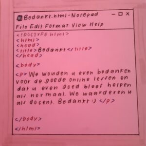 Mocht de tekst op de foto niet leesbaar zijn, dit is de mooie boodschap van de leerlingen: “We wouden u even bedanken voor de goede online lessen en dat u even goed bleef helpen als normaal. We waarderen u als docent. Bedankt:)”