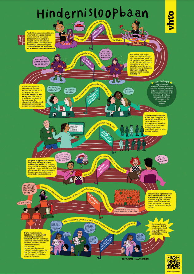 Welke hordes komen meiden en vrouwen tegen op hun weg naar bèta, techniek en IT? VHTO stelt een factsheet en een poster beschikbaar. Je kunt ze downloaden door op de afbeeldingen te klikken.